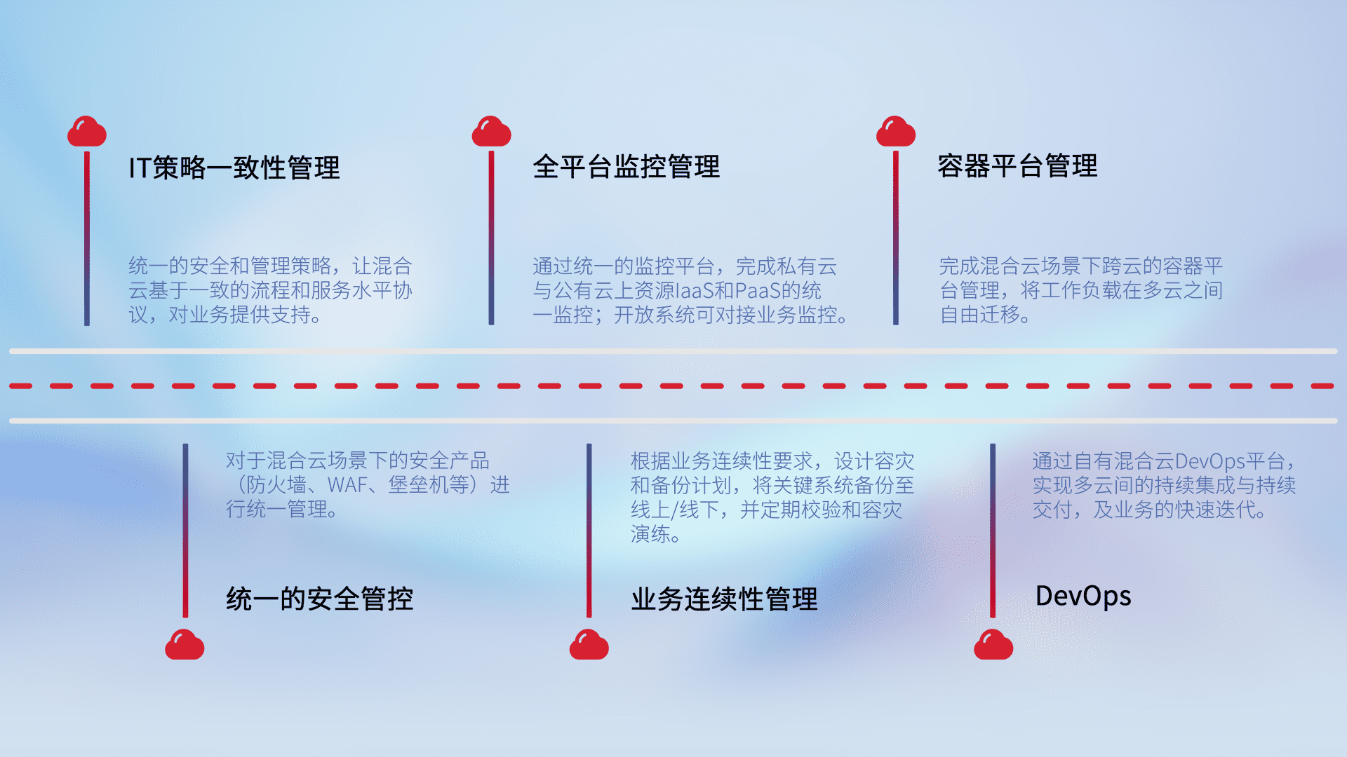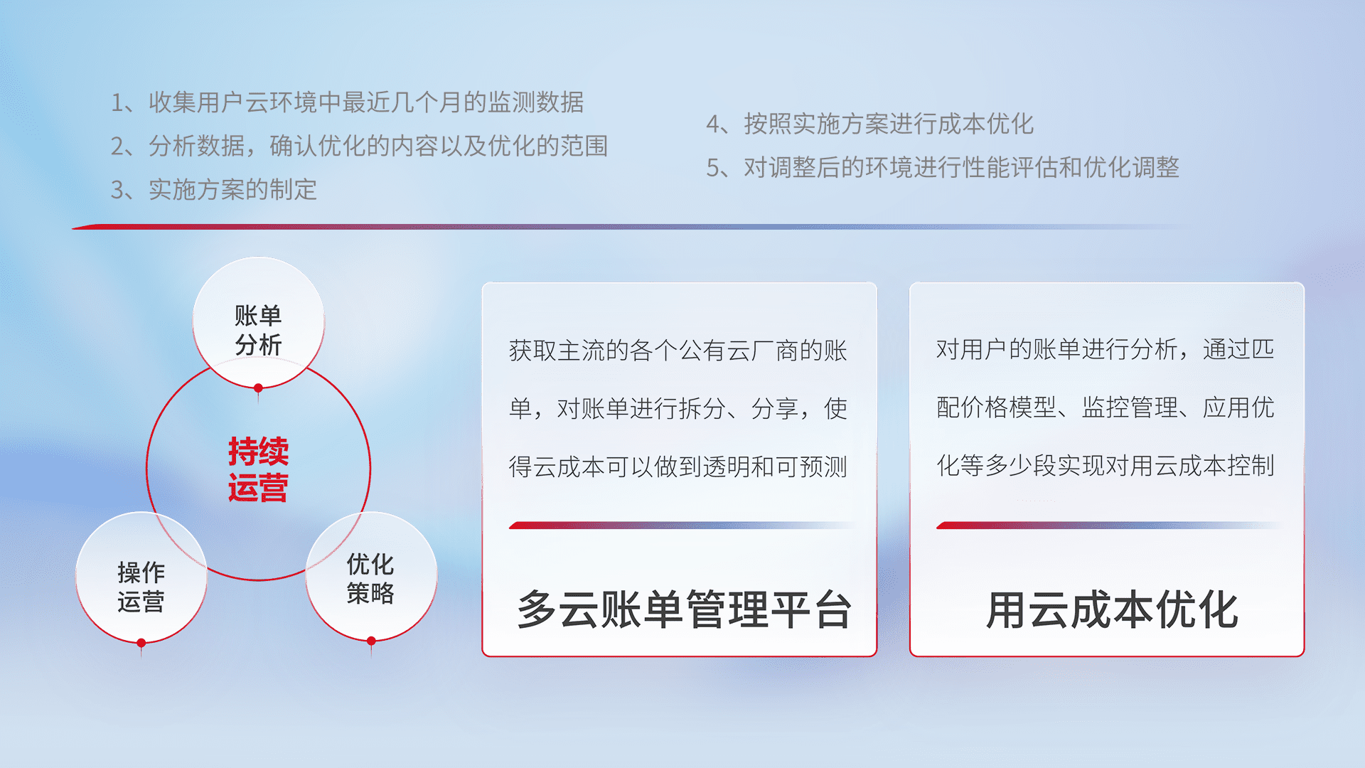 通过多云纳管,,,,以统一的资源数据模型把客户的云资源进行抽象和封装,,,进而实现对多云资源的统一操作,,,,保障云资源管理的可靠性、、、、稳定性与可用性。。量身定制化运维内容,,配置、、开发运维、、、、补丁管理、、、、备份、、、、监控、、、认证和访问管理、、、、审计和日常巡检等,,保障在用云过程中的可靠度,,,稳定度以及高可用率。。