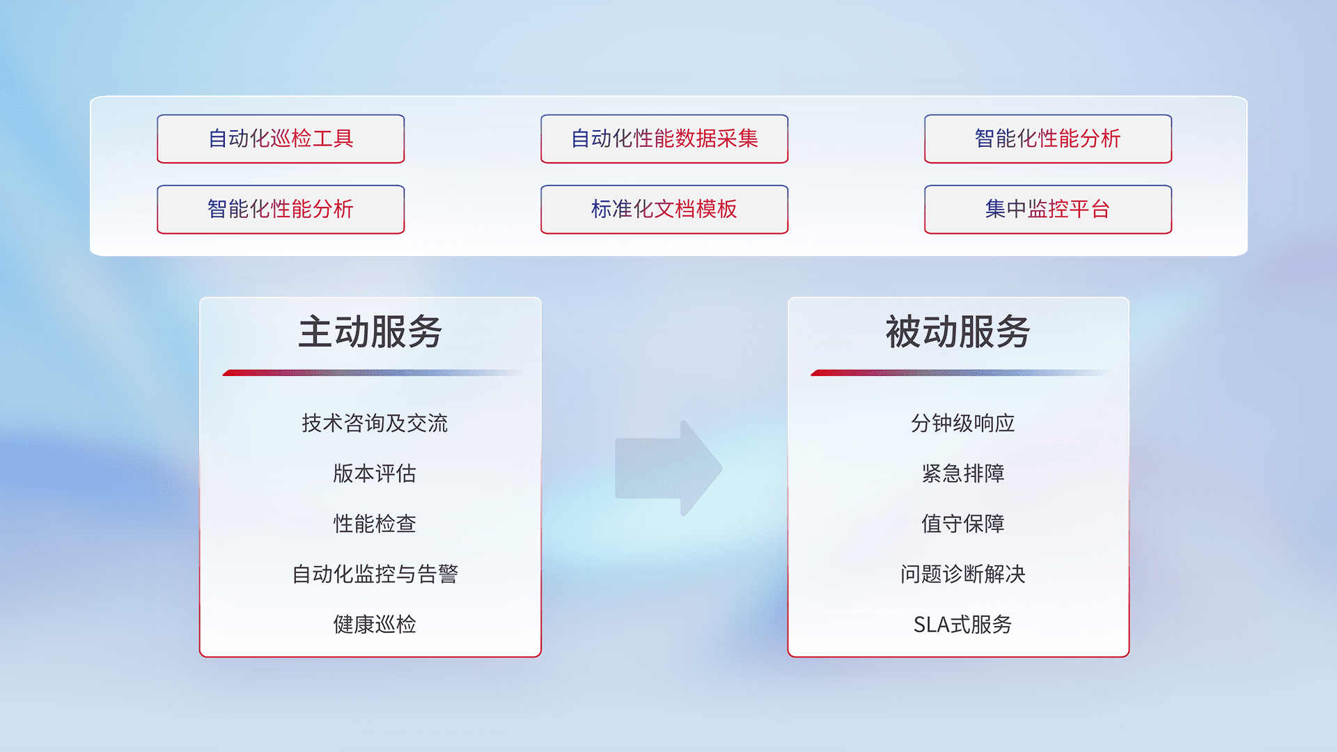 智能化工具和标准化文档,,,保障服务质量,,,提供主动服务(包含技术咨询、、、版本评估、、性能检查、、、、自动化监控与告警、、健康巡检)和被动服务包含(分钟级响应、、、、紧急排障、、、值守保障、、问题诊断解决、、、SLA服务)。。。。