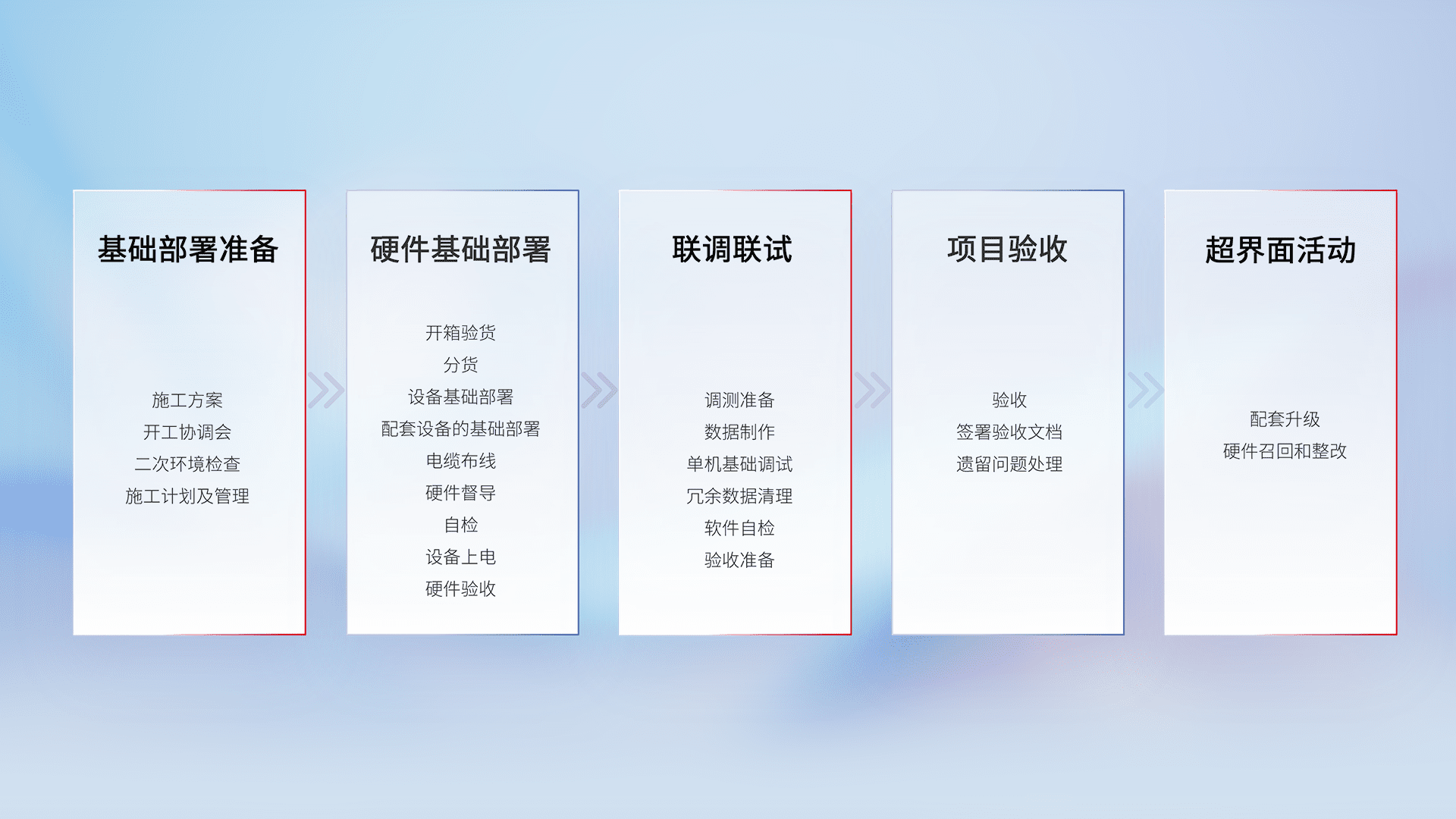 从基础部署准备、、、硬件基础部署、、、联调联试、、、、项目验收、、、、越界面活动的全过程可追溯,,,保证施工质量和进度。。。